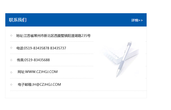 地址:常州市新北區友邦商務大廈1幢16、17層  電話:0519-85101652  傳真:0519-85112595  郵編:213022  網址:www_cz-jiayue_cn.ykyouxi.com  郵箱:xiajifengaa@163.com